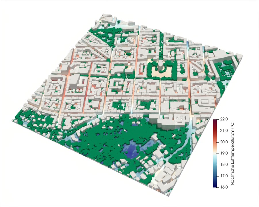 Nächtliche Lufttemperatur in 2m Höhe als ein Beispielergebnis für die im Workshop durchgeführten Simulationen